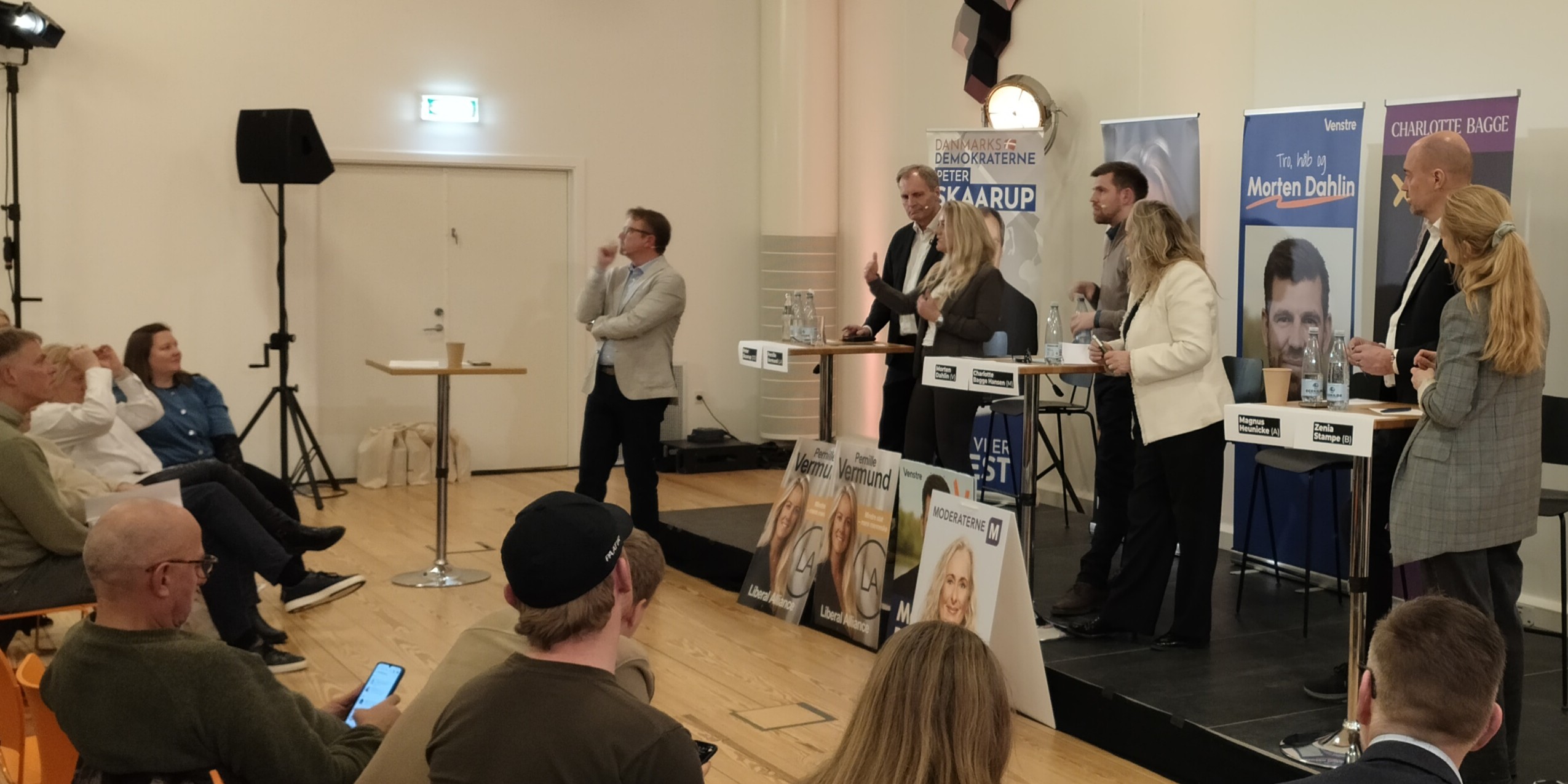 Panelet af politikere både talte og lyttede. Fra venstre er det moderator og destinationsdirektør Martin Bender, Peter Skaarup (DF), Pernille Vermund (LA), Morten Dahlin (V), Charlotte Bagge (M), Magnus Heunicke (S) og Zenia Stampe (R). (Foto: turisme.nu)